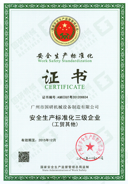 2012年12月24日,国家安全生产监督管理总局为雷竞技网页版登录公司颁发了《安全生产标准化企业证书》,这意味着我司已达到《广州市工业企业安全生产标准化评定办法》及《广州市工业企业安全生产标准化评定标准》的要求。