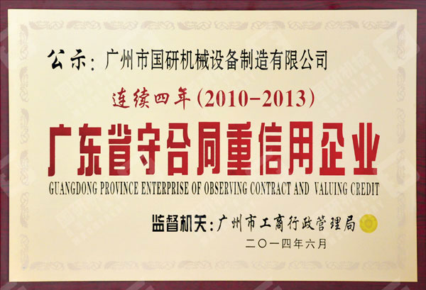 2014年7月,广州市雷竞技网页版登录设备制造有限公司获得由广东省工商行政管理局授予的2013年度“广州省守合同重信用企业”荣誉称号。这是公司连续多年来多次获此殊荣。