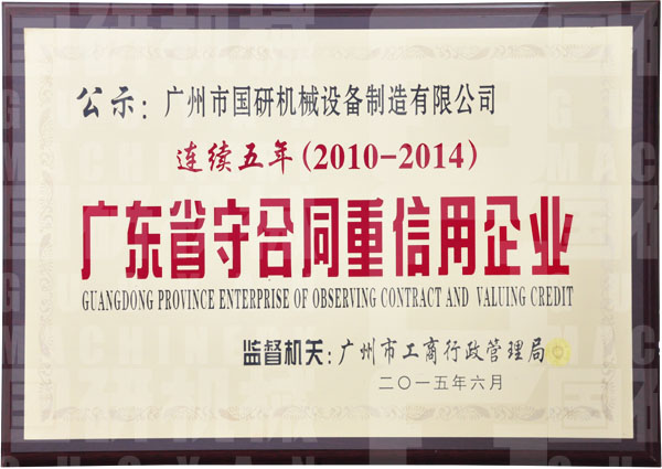 “连续五年(2010-2014)广东省守合同重信用企业”的牌匾在广州市雷竞技网页版登录设备制造有限公司的文化展示墙上格外引人注目,这是对公司多年坚持诚信经营的充分肯定,也是公司企业文化“诚信、创新、分享、精进”的客观体现。
