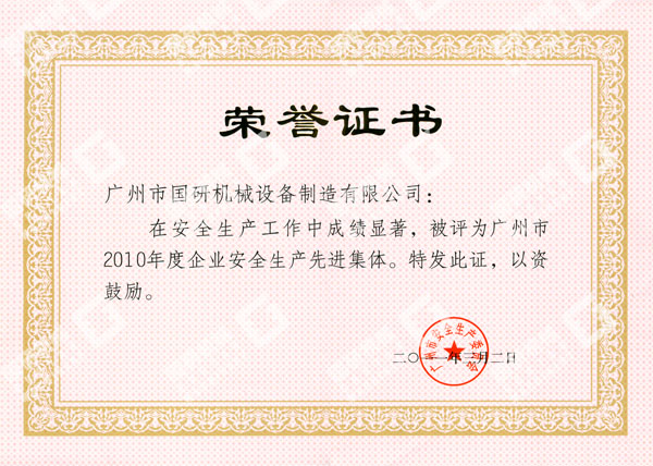 近日,在广州市人民政府召开的安全生产工作总结暨表彰大会上再次传来喜讯,广州市雷竞技网页版登录设备制造有限公司被广州市人民政府授予“广州市2010年度企业安全生产先进集体”荣誉称号。这是我司获得中华全国总工会和国家安全生产监督管理总局授予2009年度全国“安康杯”竞赛优胜企业称号后,被授予的又一殊荣。